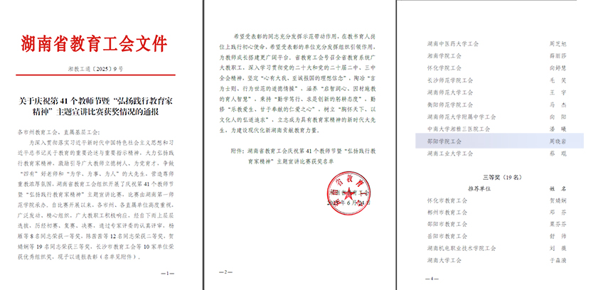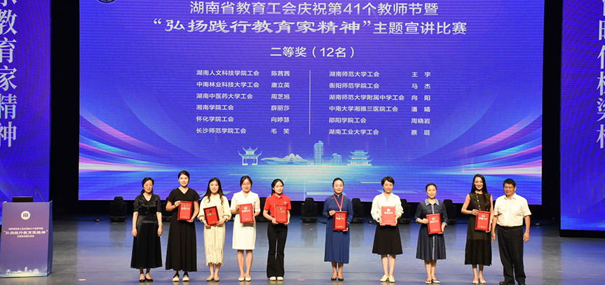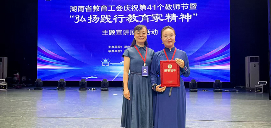 9月5日上午,由湖南省教育工会主办的庆祝第41个教师节暨“弘扬践行教育家精神”主题宣讲比赛颁奖典礼在湖南第一师范学院举行。此前,由湖南省教育工会主办、湖南第一师范学院承办的“弘扬践行教育家精神”主题宣讲比赛决赛在长沙举行。beat365音乐舞蹈学院副院长周晓岩老师以生动感人的育人故事和深厚教育情怀, 从全省各大高校39名优秀选手中脱颖而出,荣获二等奖。