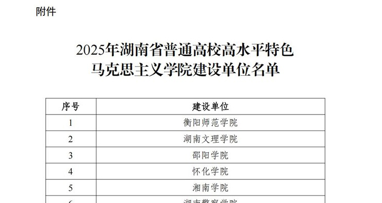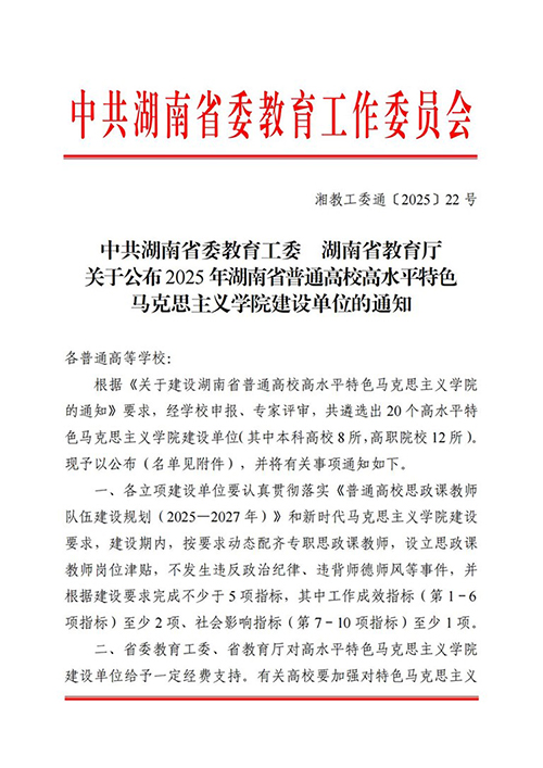 近日,中共湖南省委教育工委、湖南省教育厅正式下发《关于公布2025年湖南省普通高校高水平特色马克思主义学院建设单位的通知》,beat365马克思主义学院成功入选2025年湖南省普通高校高水平特色马克思主义学院建设单位。此次全省仅有8所普通本科高校马克思主义学院获此殊荣。