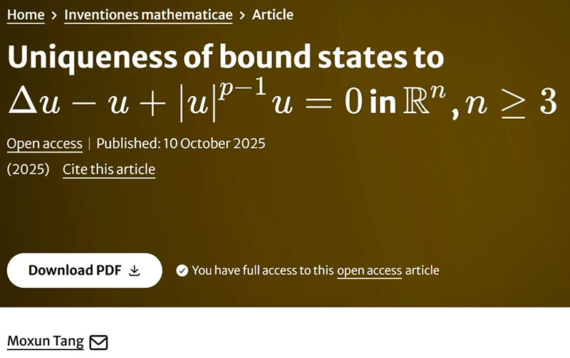唐谟勋校友的研究,针对国际数学界Berestycki与Lions(其中Lions于1994年获菲尔兹奖)于1983年提出的“n≥3时n维欧氏空间内半线性椭圆方程束缚态唯一性”猜想,给出了完全肯定的回答。该方程源于Klein-Gordon方程与非线性薛定谔方程的驻波求解问题,是偏微分方程(PDE)领域的核心问题之一。研究证明:对每个整数k≥1,该问题存在唯一径向对称解,且在平移与反射变换下,解在原点以外区域恰好有k个零点,为相关领域研究提供了关键理论支撑。