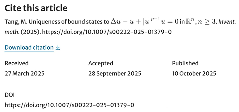 据悉,该成果最初版本于2024年9月上传至预印版平台arXiv,2025年3月向《Inventiones Mathematicae》投稿,仅用不到半年便完成审稿并在线发表,审稿效率与成果认可度均处于国际顶尖水平。
